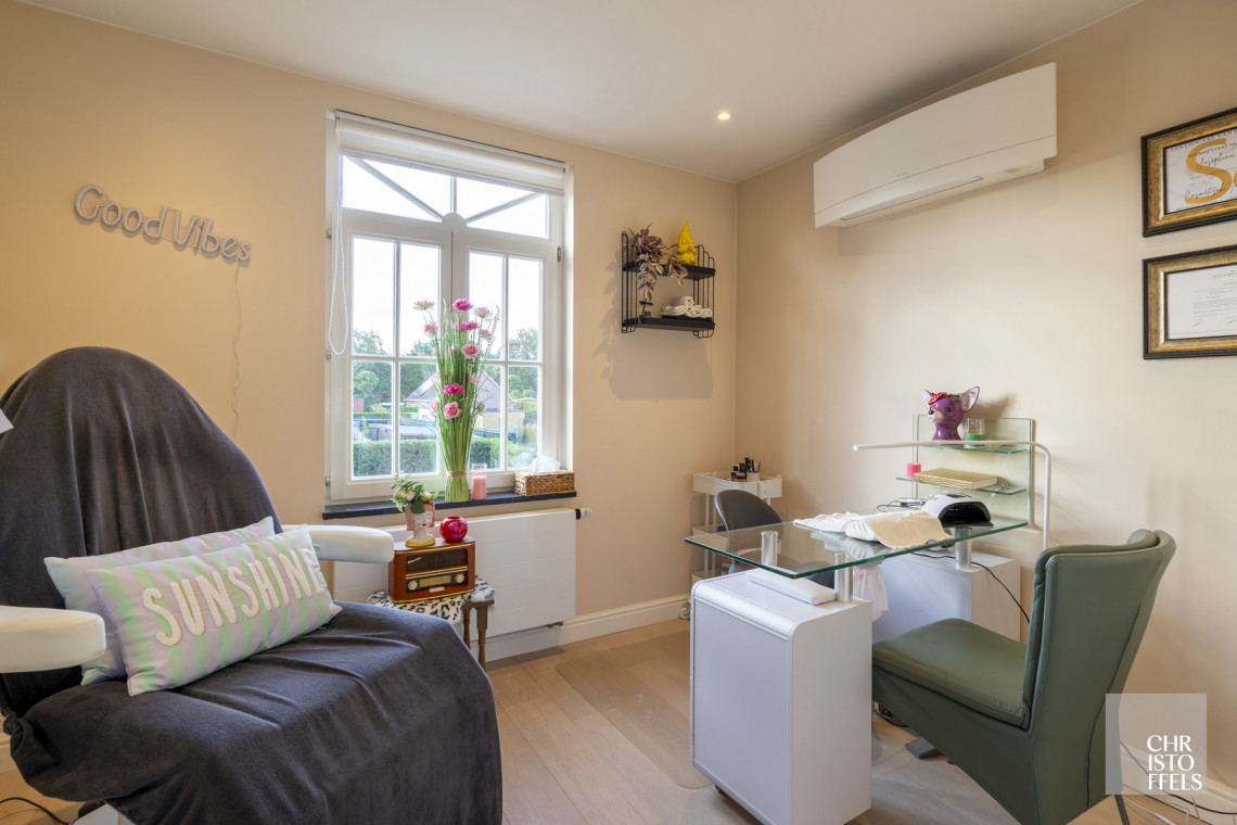 Aansluitend vindt u de gezellige woonkamer met eethoek, zithoek met sfeervolle gashaard en een praktische kantoorruimte. Verder beschikt het gelijkvloers over een bijkeuken met maatwerkkasten en een gastentoilet.