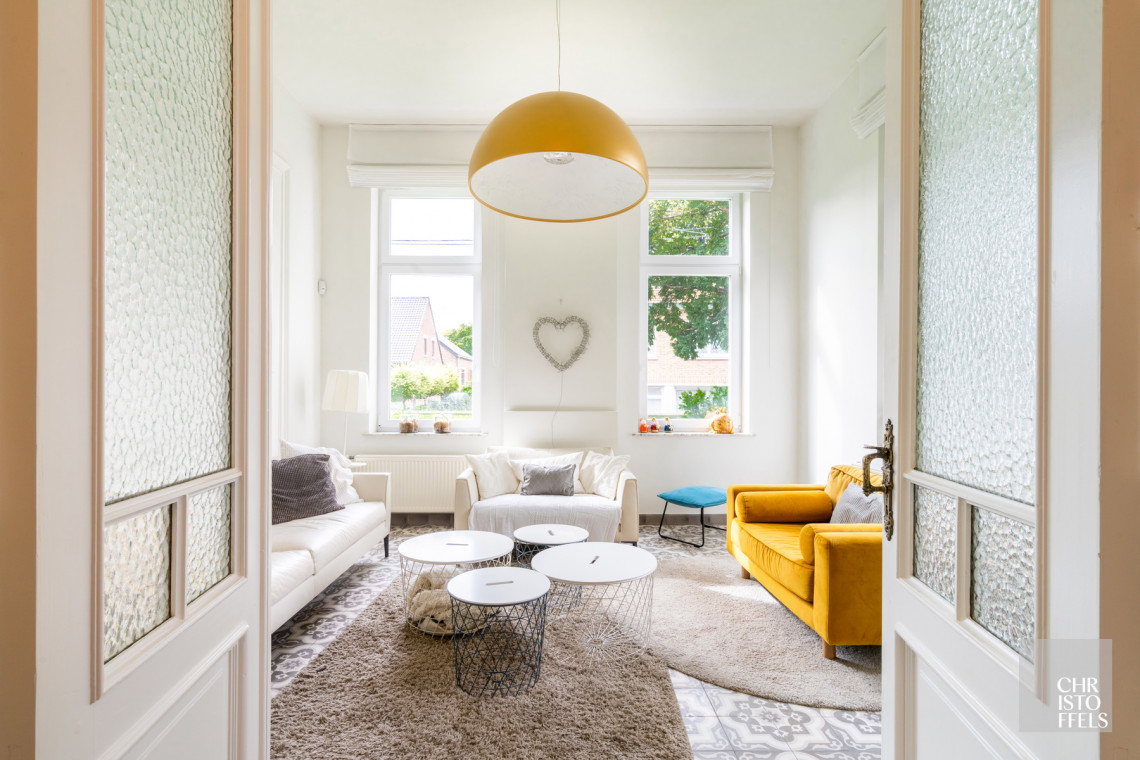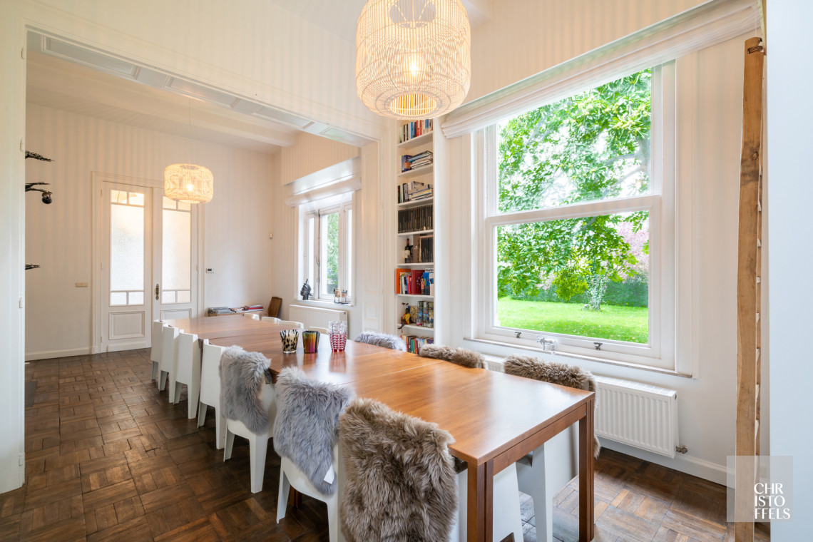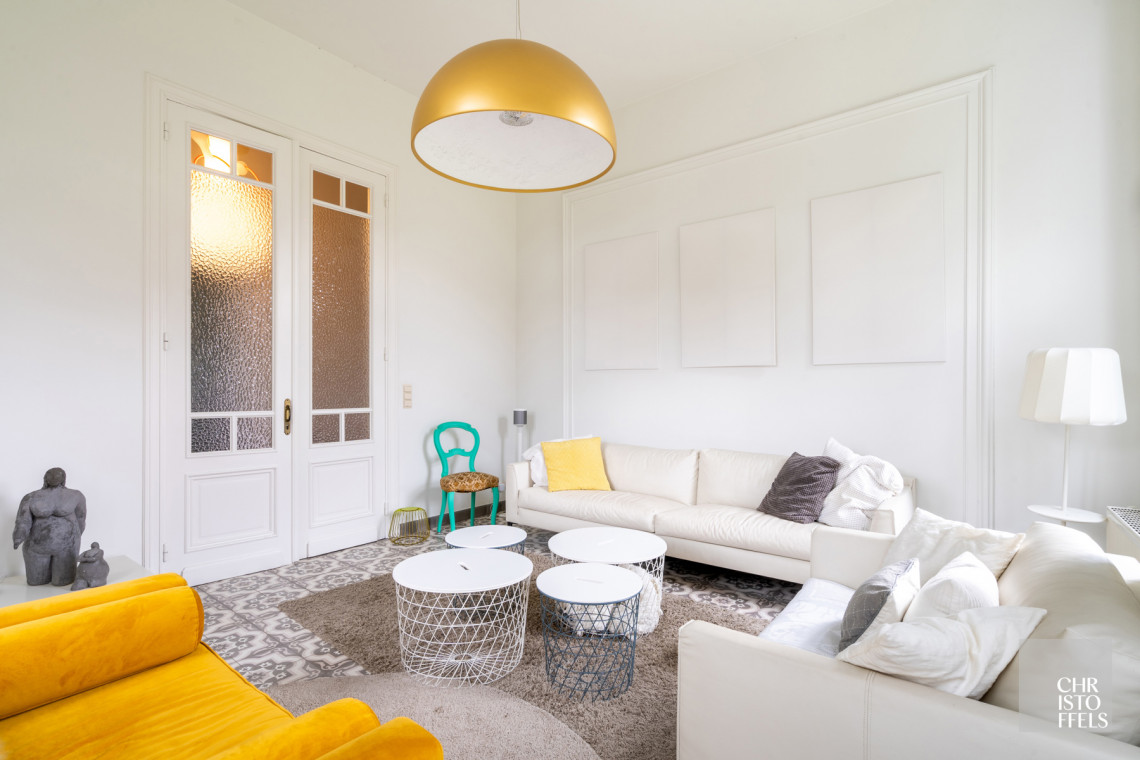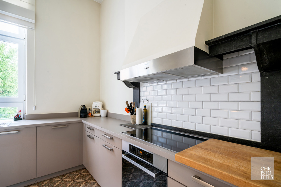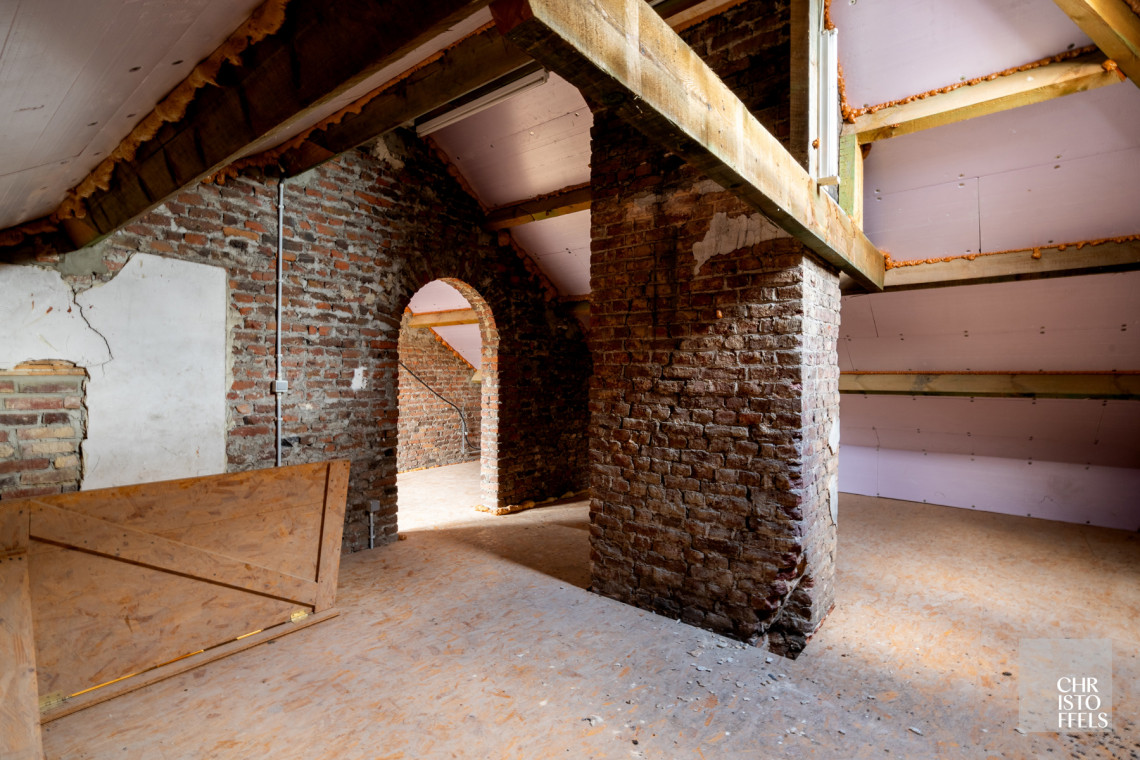 Op het gelijkvloers is er de inkomhal met gastentoilet en vestiaire. Aansluitend bevindt zich het bureel, de leefruimte met een karaktervolle parketvloer, de ruime eetkamer, wasplaats en 2 keukens waarvan nog 1 keuken te installeren. Verder is er toegang tot een nog aan te leggen terras met zicht op de tuin.