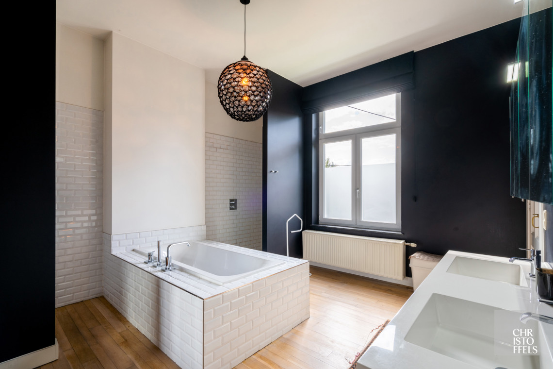 De badkamer op het eerste verdiep is ingericht met een ligbad, douche, toilet en dubbele wastafel geïntegreerd in het badkamermeubel.